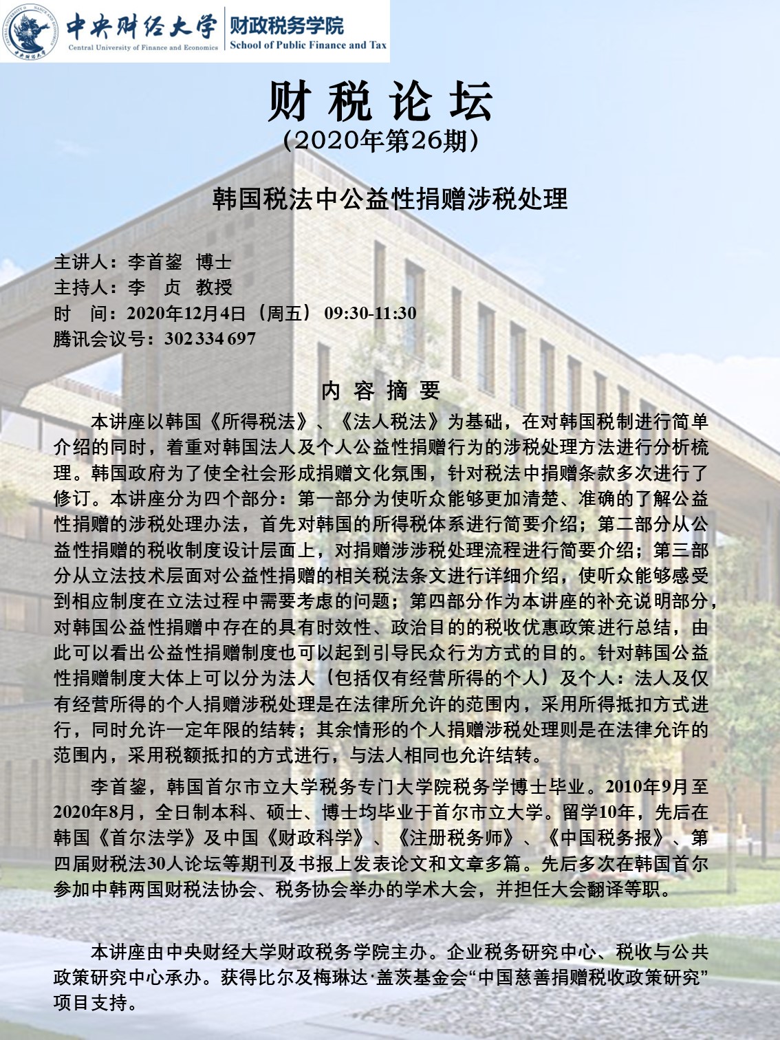财政税务学院召开“韩国税法中公益性捐赠涉税处理”财税论坛