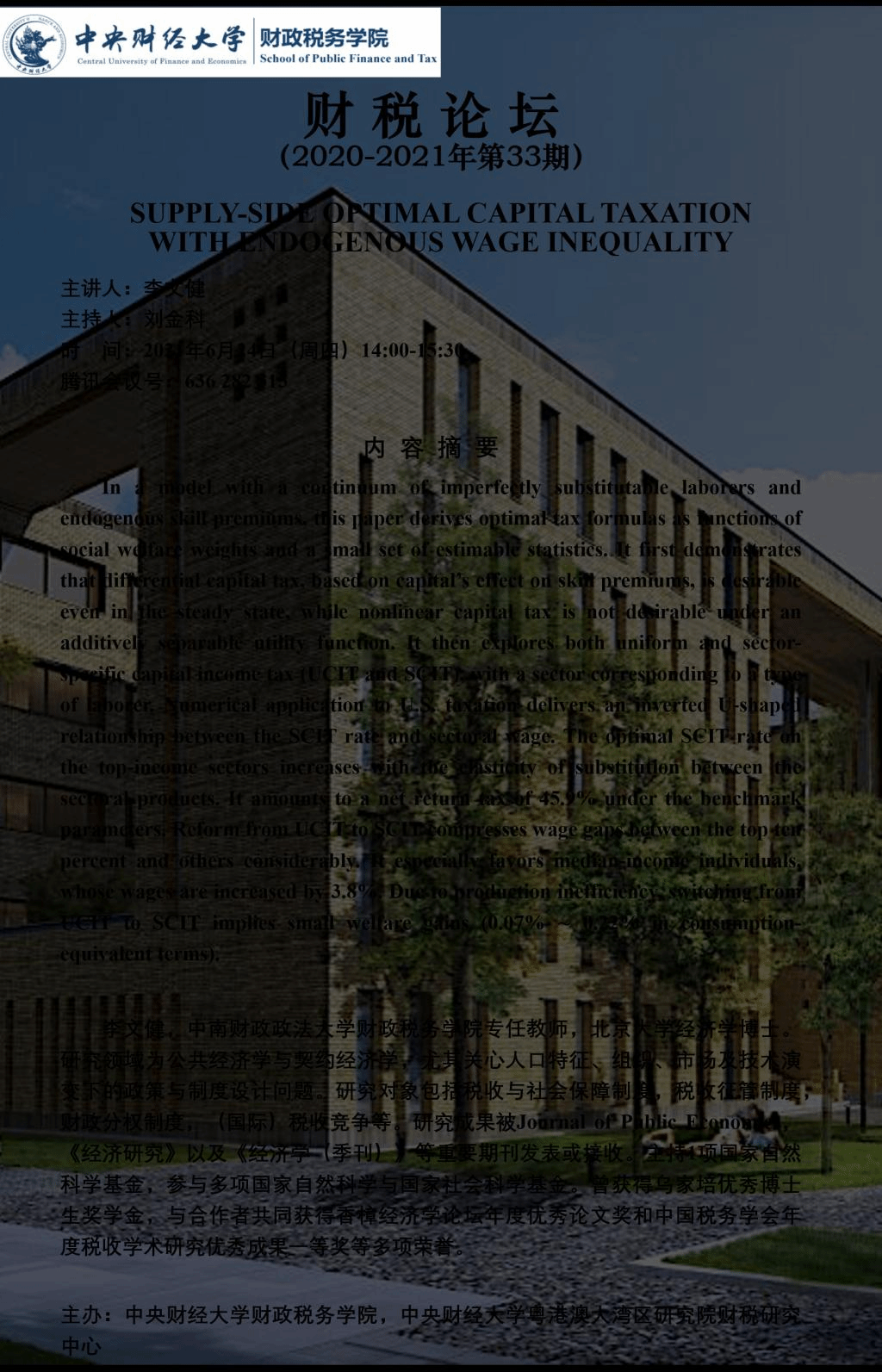【财税论坛】SUPPLY-SIDE OPTIMAL CAPITAL TAXATION WITH ENDOGENOUS WAGE INEQUALITY