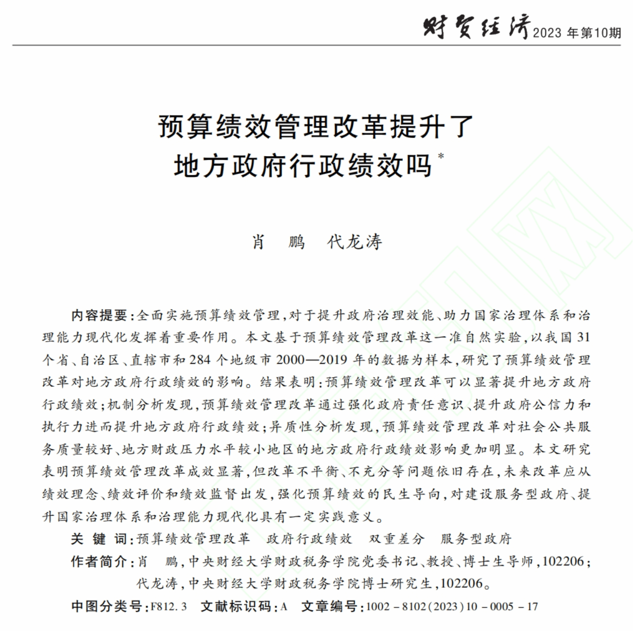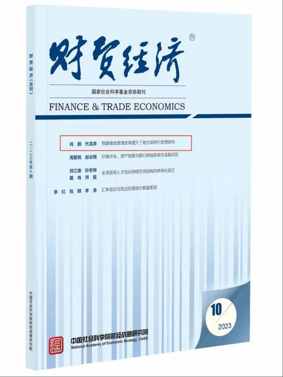 近日,由九游电子肖鹏教授和代龙涛博士撰写的论文《预算绩效管理改革提升了地方政府行政绩效吗》在中文A类期刊《财贸经济》2023年第10期作为封面文章刊发。以下为文章主要内容: