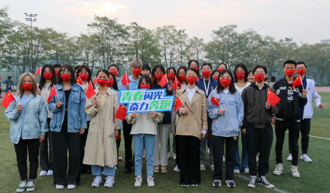 主题教育活动结束后,我院学生举着国旗和“青春闪光、奋力奔跑”等祝福标语在校园中合影留念。