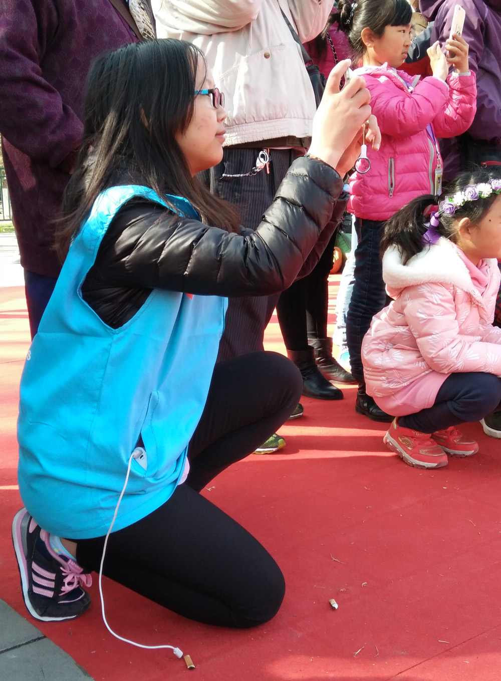 随后志愿者们纷纷来到各自的岗位,开始一天的奉献之旅。上午志愿者们在樱花节游艺表演的现场负责维持秩序,为现场的游客们端茶送水并为表演者拍摄照片。表演一开始,便有大量的游客被优美的乐声吸引而至,游客在志愿者们的引导下有序地在指定区域观看表演。台上的歌者一曲才罢,便有志愿者立刻送上一杯热水,供他们温润喉咙、驱散疲乏。表演者们曼妙的舞姿和炫目的特技都被志愿者们拍摄下来,在屏幕上永远定格。