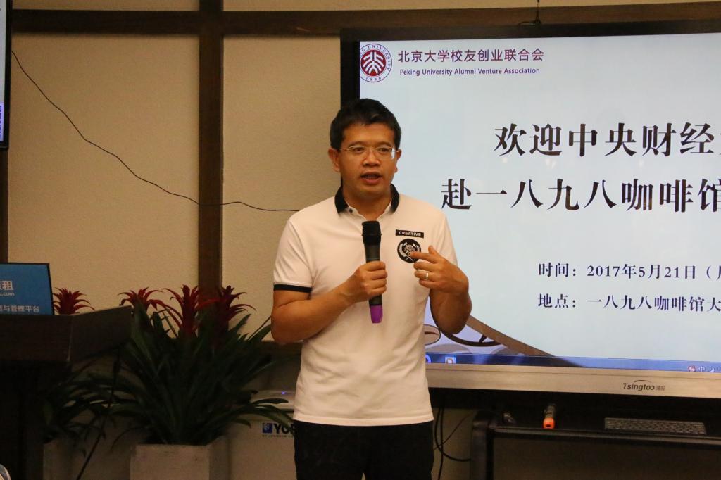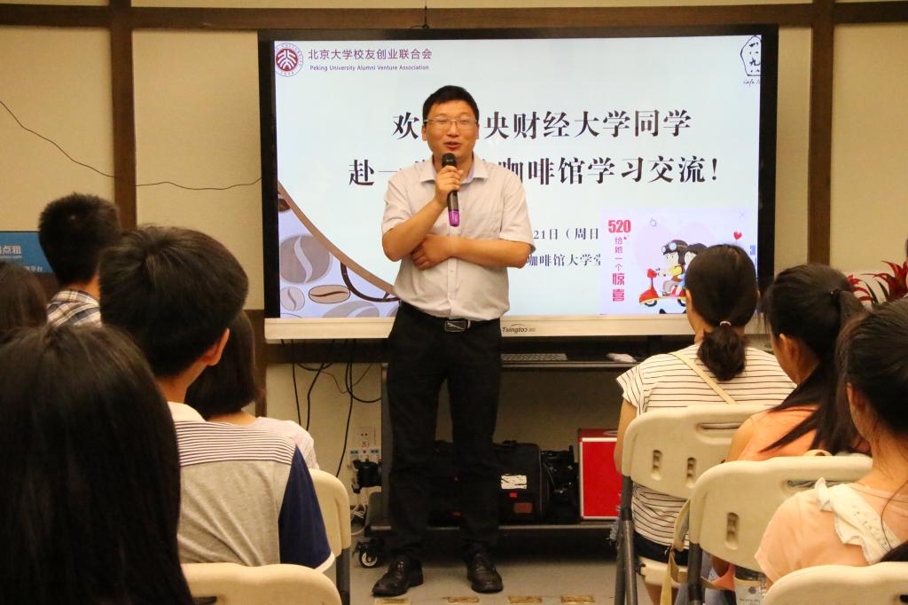 上半场的活动由北京大学校友创业联合会执行秘书长蔡润维先生主持,他首先对咖啡馆进行了简要的介绍。1898咖啡馆于2013年依托北京大学校友创业联合会创建,是国内首家校友创办的公司,开创了中国式众筹的新模式。而后有三位咖啡馆的股东上台发言。文钊先生介绍了创建咖啡馆的历程和中国式众筹的发源,并分析了中国式众筹的特色。基于中国社会人们普遍对陌生人缺乏信任的特点,国外的众筹模式在中国寸步难行,而北大校友开创的中国式众筹模式从小圈子做起,便摆脱了这个困境,并取得辉煌成就。关于大学生创业,他指出大学生应当先学好专业知识,全面提升自身的能力后再去创业。章叶飞女士结合自己的工作经历给大家提出了创业建议,鼓励同学们在学习的同时接触社会,开阔视野。陆德忠先生介绍了自己创建甘肃1898咖啡馆的过程,并结合自己担任大创评委的经历分析了大学生创业的特点,他建议同学们在创业的过程中侧重对市场的调查和可行性的分析。