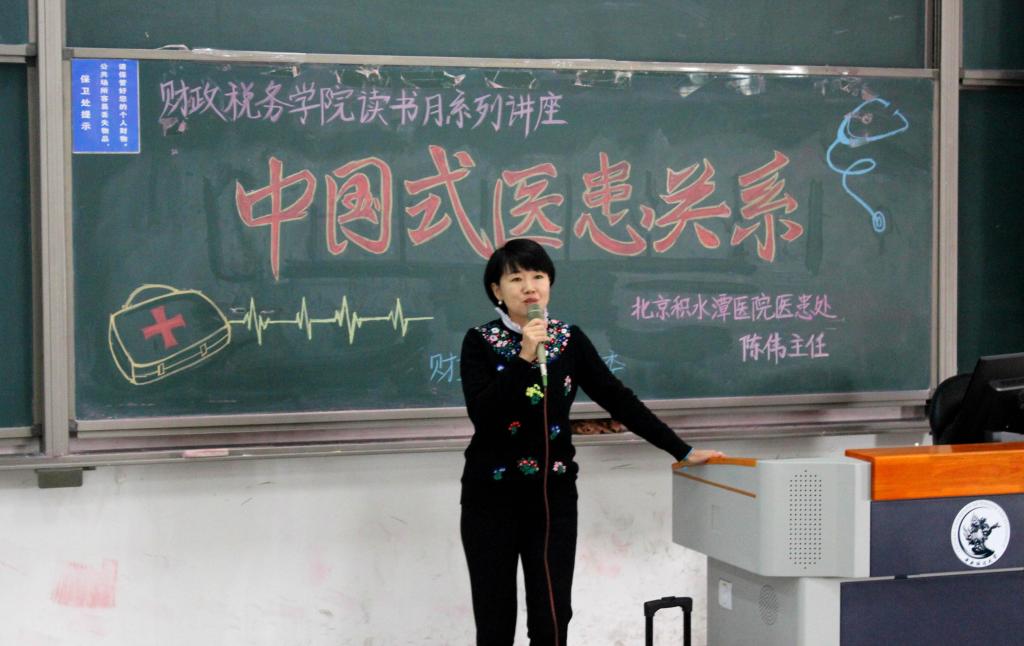 11月22日下午两点,财政税务学院在中央财经大学沙河校区东区主教216举办了第八届读书月系列讲座之“中国式医患关系”讲座。本次讲座邀请到了北京积水潭医院医患处主任陈伟主任,与大家分享她对中国式医患关系的理解和感悟。财政税务学院党委副书记宋立岩老师、团委副书记陈颖老师出席了本次讲座,全体本科同学参与其中。