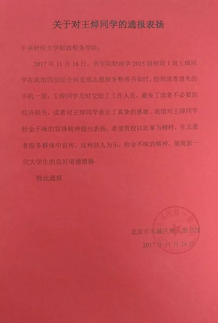 事后,找回手机的读者对王焯同学表达了真挚的感谢,北京市东城区图书馆也对王焯同学拾金不昧的雷锋精神给予了高度赞扬,并给我院发来了通报表扬信。