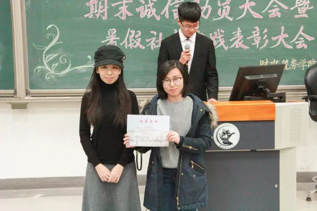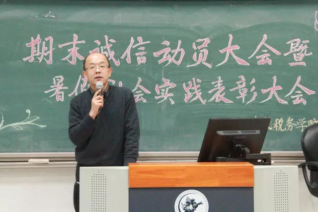 2017年12月27日星期三晚8:30,财政税务学院在中央财经大学沙河校区东区主教219教室举办了期末诚信动员大会暨暑期社会实践表彰大会。财政税务学院党委副书记宋立岩老师、学生工作办公室主任于来老师、本科生第一党支部书记王乐天老师、团委副书记陈颖老师、2017级本科生辅导员徐燕妮老师出席本次活动。财政税务学院2017级全体新生和2016、2015级学生代表参加。