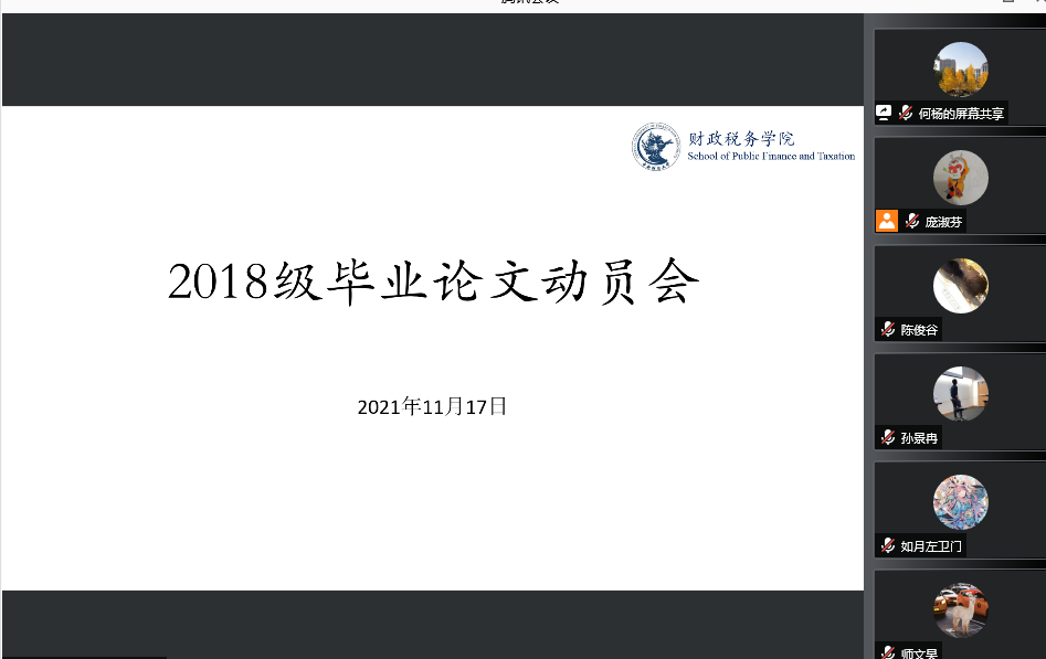 11月17日下午,九游电子2022届毕业生毕业论文动员大会通过“腾讯会议”以线上会议的形式顺利举行。此次会议的主要目的是向2022届本科毕业生介绍毕业论文相关事宜、大致时间安排、基本流程,让毕业生了解毕业论文的重要意义,准确把握学术论文规范、合理安排论文进度。参加本次会议的有副院长何杨教授、财政管理系孙景冉老师、资产评估系彭章老师、学院教学科研办公室庞淑芬老师以及2018级的全体本科生。此次会议由何杨副院长主持。
