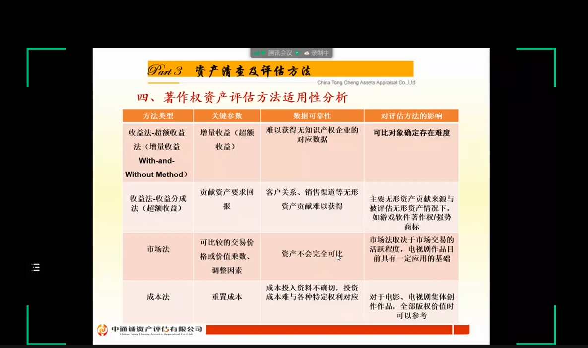 中通诚资产评估有限公司副总裁袁煌先生围绕著作权资产评估基础、评估对象识别与特点、资产清查及评估方法三方面进行讲解,同时分别向同学们展示收益法、成本法和市场法在著作权资产评估案例中的具体应用,并与同学们共同探讨分析著作权资产评估在实务中面临的问题。