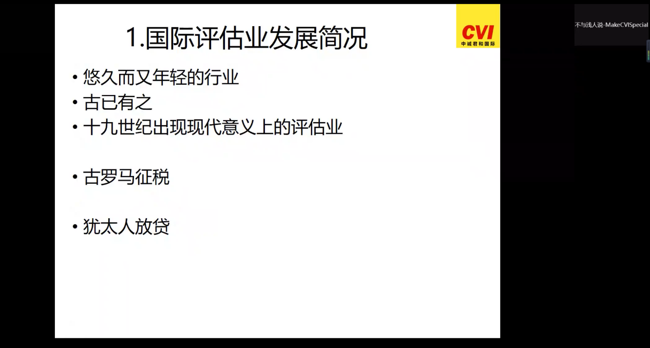 中诚君和(北京)国际资产评估有限公司董事长王诚军先生从国外资产评估的历史出发,结合时代特征和资产评估业发展情况为同学们介绍了国外资产评估体系和相关准则。通过王诚军先生的讲授,同学们国际化评估思维和视角得到了较大的提升。