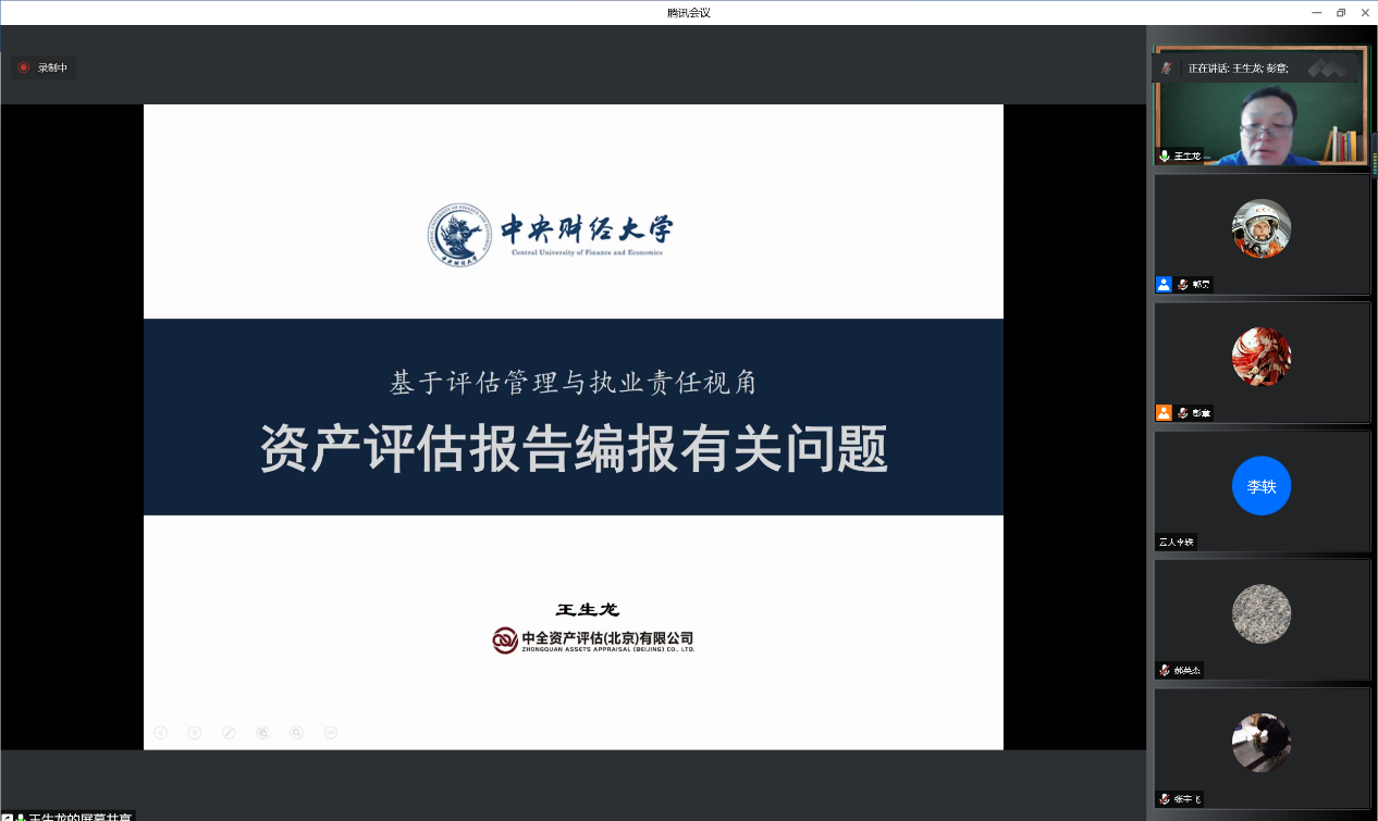 2022年4月-6月期间,我院“资产评估大讲堂”系列讲座于每周三下午通过腾讯会议线上举办。副院长李小荣教授邀请了来自资产评估实务领域的各位专家,就评估案例与实务同2021级资产评估专业硕士的同学们进行了深入交流。