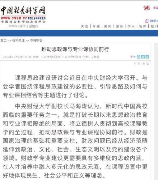 2020年4月12日,由教育部财政学类专业教学指导委员会主办,中央财经大学财政税务学院和中国财政发展协同创新中心承办的第五期财政学类专业骨干课程教学分享会顺利举办。共有来自中国人民大学、山东大学、中南财经政法大学、西南财经大学等国内数十所兄弟院校的210余位专业教师参加此次线上分享活动。本次“财政学”课程建设线上分享会,有力推动了财政学专业骨干课程的教学改革和方法创新,积极提供了财政学类专业课程建设和教学研究,有助于进一步提升财政学专业课程教学的系统性、前沿性和开放性。《中国社会科学报》对财税学院的课程思政建设进行了报道。