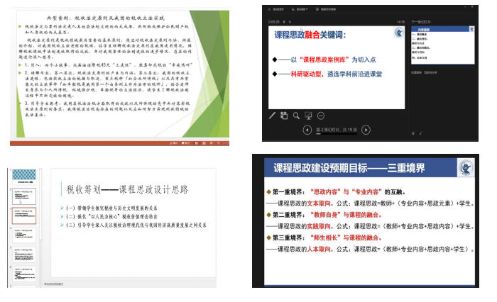 高萍教授结合《税法》课程,就课程思政建设如何融入在专业课程之中,以及在建设课程思政过程中对教师的要求进行了分享。王文静副教授结合《税收筹划》和《外国税制》课程,以学情分析结果为起点,就课程教学中学生对税法背后的政策背景了解不足、对避税和逃税等相关基本概念了解不足等问题为起点,对课程思政建设的思路进行了分享。肖鹏教授结合《政府预算管理》,分享了将案例库构建和课程团队成员的科研工作融入课程思政的相关经验。李贞教授结合《财政学》课程,分享了财政学与课程思政建设的关系,将课程思政融入财政学能够提升财政学的视野和教学效果,更好地实现财政学的教学目标和对财政学专业学生的人才培养目标。孙鲲鹏副教授《税收筹划》课程以思政建设为基础,从宏观要求和微观案例的角度,结合案例教学、教研结合、数字技术支持等方面进行了分享。王小荣副教授结合《国有资产管理与评估》课程,分享了如何挖掘资产评估专业硕士的课程思政元素,以及如何更好使学生接受和理解国有资产管理评估实践中的课程思政问题。