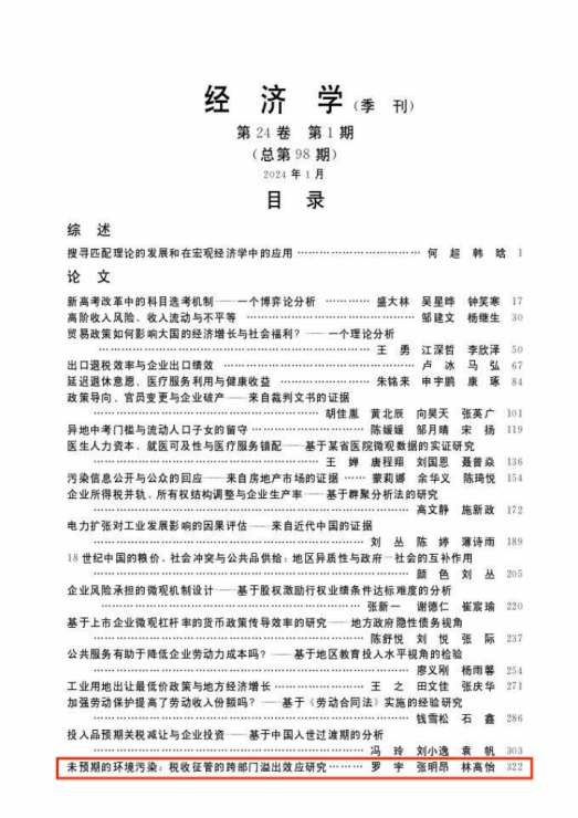 由九游电子副教授张明昂、博士研究生罗宇与广东外语外贸大学林高怡合作撰写的论文《未预期的环境污染:税收征管的跨部门溢出效应研究》刊发于中文AA类期刊《经济学(季刊)》2024年第1期。以下为文章主要内容。